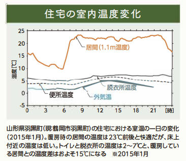 先にふれた山形での調査ですが、結果を受けて八幡町でも啓発活動が行われ、4年後に同じ100軒の家を調査したところ、10軒で改善が見られました。それでも、暖房している居間とトイレの温度差は15℃もあり、ヒートショックが起こる可能性は否定できない状況でした。
